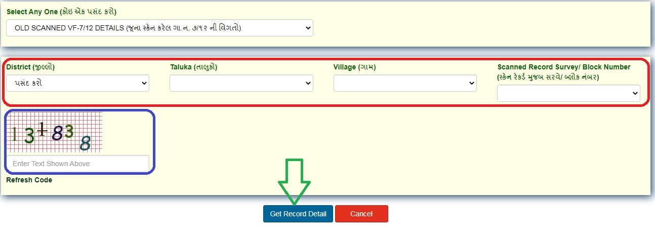 Example: For 7/12 details, select "Old Scanned VF-7/12 Details" (જૂના સ્કેન કરેલ ગામ નમૂના નં. ૭/૧૨).