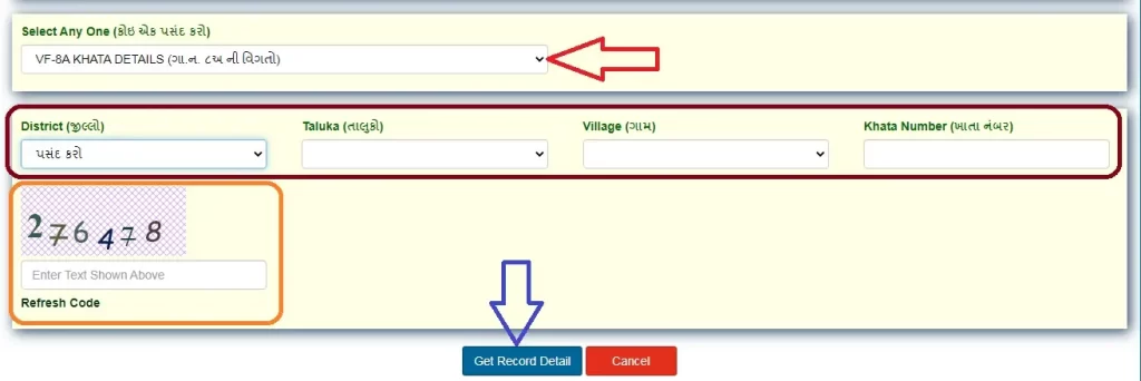 Under "Select Any One", choose "VF-8A Khata Details (ગામ નમૂના નં. ૮અ ની વિગતો)".